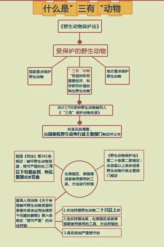 所谓三有保护动物,即国家保护的有重要生态、科学、社会价值的陆生野生动物。2000年5月,国务院野生动物行政主管部门在北京召开了专家论证会,制定了《国家保护的有益的或者有重要经济、科学研究价值的陆生野生动物名录》(简称“三有名录”),于2000年8月1日以国家林业局令第7号发布实施。根据《中华人民共和国刑法》及相关司法解释,非法狩猎野生动物20只以上的;违反狩猎法规,在禁猎区、禁猎期或者使用禁用的工具、方法狩猎;具有其他严重情节的属于非法狩猎“情节严重”。
