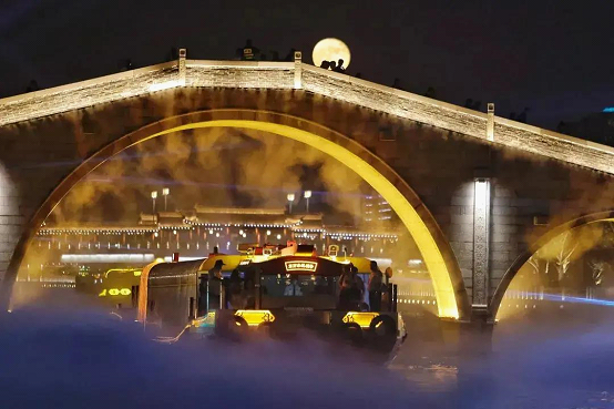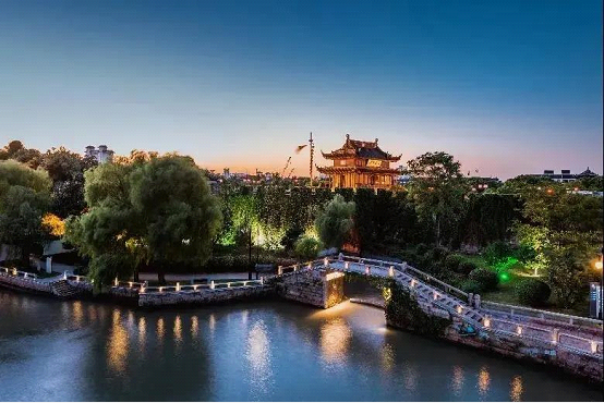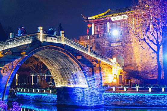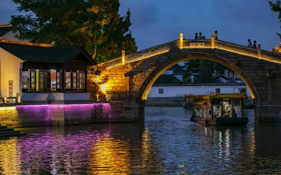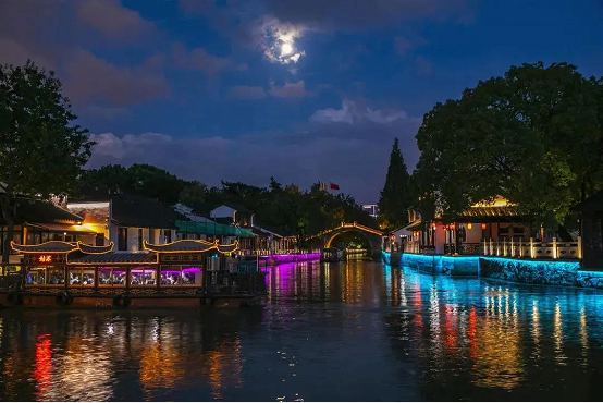 从觅渡桥乘船前行,到运河世界文化遗产点——盘门,沿途欣赏水陆联动、灯光投影的实景演出《水韵江南》,彰显千年姑苏独具风韵的运河文化。