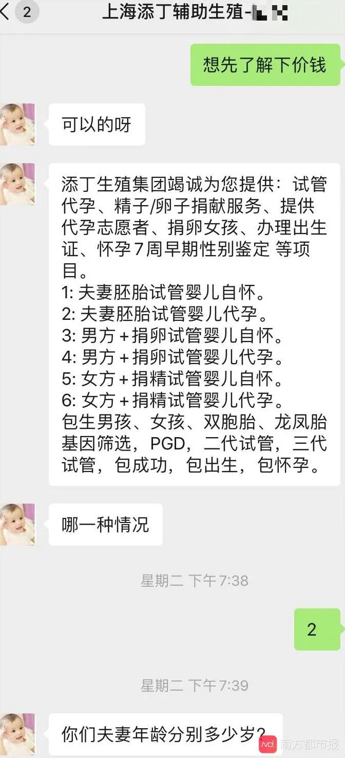 去年9月中旬,南都记者曾暗访上海多家提供代孕服务的中介机构。一家位于上海市宝山区名为“天使助孕”的中介机构负责人陈女士介绍,其公司推出65和90万元两种代孕套餐,前者无法确保婴儿性别,后者则可指定性别,两种套餐均可分期付款,保证能在两年内向客户“交出”健康宝宝;另外一家位于上海市杨浦区名为“上海添丁生殖集团”的代孕机构,则声称提供夫妻精卵、男方精子+捐卵、女方卵子+捐精等多种形式组合的试管婴儿代孕服务,价格从65万元到90万元不等。