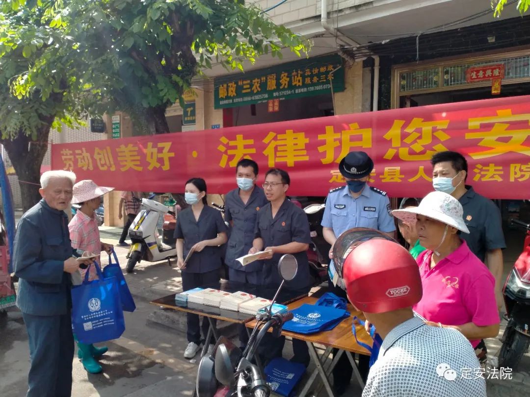 4月28日上午,在“五一”国际劳动节到来之际,定安法院执行局干警前往富文镇,开展以“劳动创美好·法律护您安”为主题的法律宣传活动。