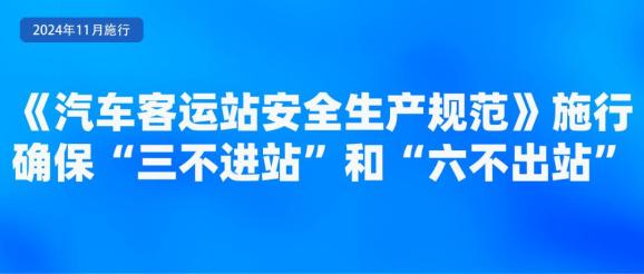 交通运输部修订印发《汽车客运站安全生产规范》,于2024年11月1日起施行。《规范》明确,汽车客运站经营者应当对进出汽车客运站候车区和发车区的人员和行李物品、车辆进行严格检查,确保“三不进站”和“六不出站”。“三不进站”是指:危险品不进站、无关人员不进站(发车区)、无关车辆不进站(发车区)。“六不出站”是指:超载或违规装载营运客车不出站、安全例行检查不合格营运客车不出站、旅客未系安全带不出站、驾驶员资格不符合要求不出站、营运客车证件不齐全不出站、“出站登记表”未经审核签字不出站。