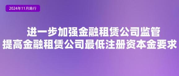 金融监管总局修订发布了《金融租赁公司管理办法》,自2024年11月1日起施行。《办法》共有9章。主要修订内容如下:一是修改完善主要出资人制度。提高金融租赁公司最低注册资本金要求,增强风险抵御能力;新增国有资本投资运营公司、国有金融资本投资运营公司和境外制造业企业三类主要出资人类型;适当提高主要出资人的总资产、营业收入、注册资本等市场准入标准以及最低持股比例要求,强化主要出资人的股东责任。二是强化业务分类监管。按照业务风险程度及所需专业能力差异,进一步厘清基础业务和专项业务范围,删除非主业、非必要类业务,严格业务分级监管。三是加强公司治理监管。进一步明确了金融租赁公司党的建设、“三会一层”、股东义务、薪酬管理、关联交易、信息披露等方面监管要求。四是强化风险管理。明确金融租赁公司资本充足、信用风险、流动性风险、操作风险以及重大关联交易等方面的监管要求,优化增设部分监管指标,明确监管评级、监管强制措施等方面要求。五是规范涉外融资租赁业务。明确相关业务经营规则,明确金融租赁公司在境外设立项目公司作为专项业务进行管理。六是完善业务经营规则。