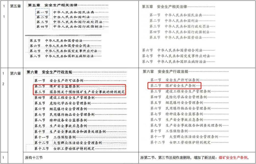 第六章 由十三节改为十二节;删除了两部作废的法规,新加了一部“煤矿安全生产条例”