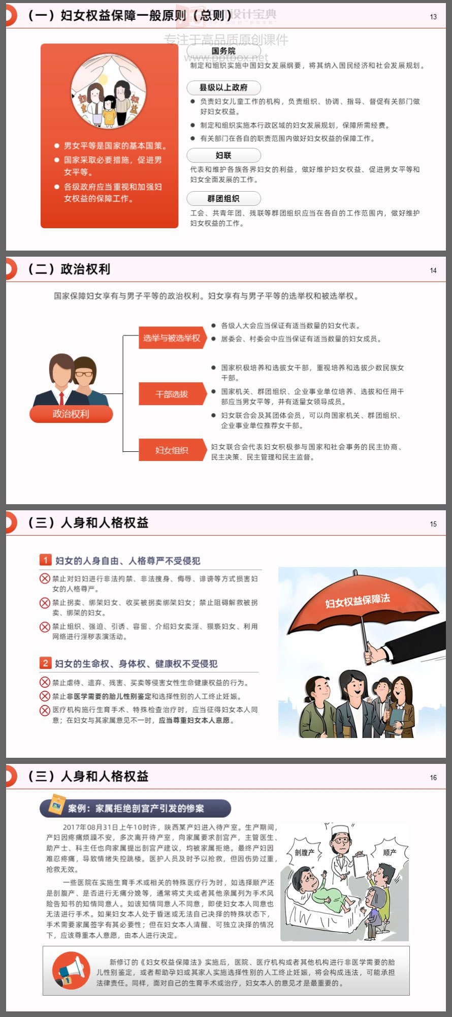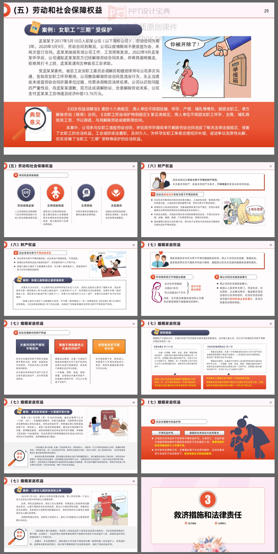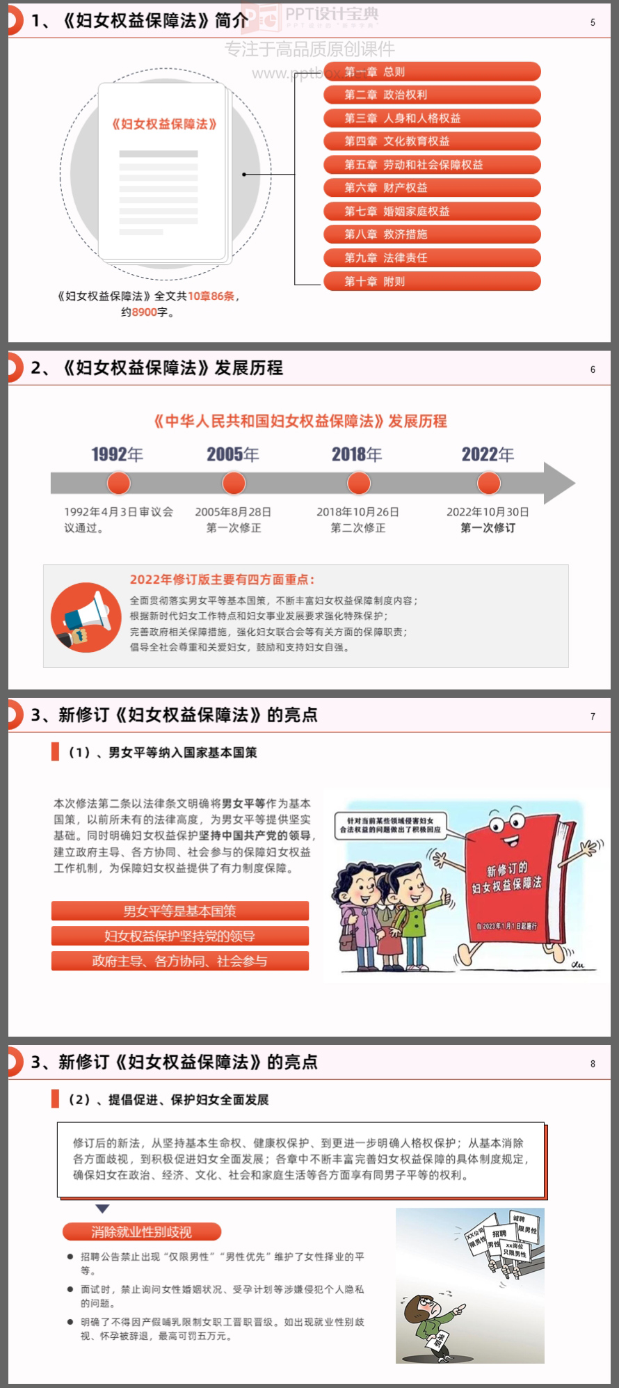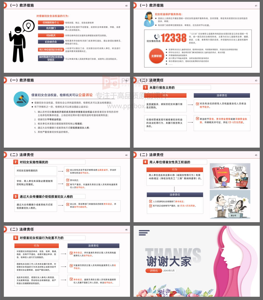 本PPT就是以新修订的《妇女权益保障法》为蓝本制作。涉及的知识点包括:新修订《妇女权益保障法》的亮点、妇女的各项权益及保障、救济措施和法律责任……等内容。