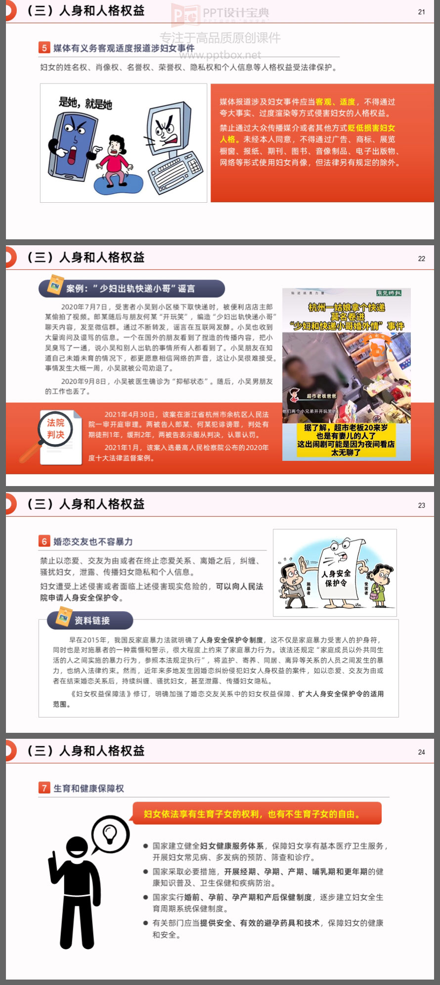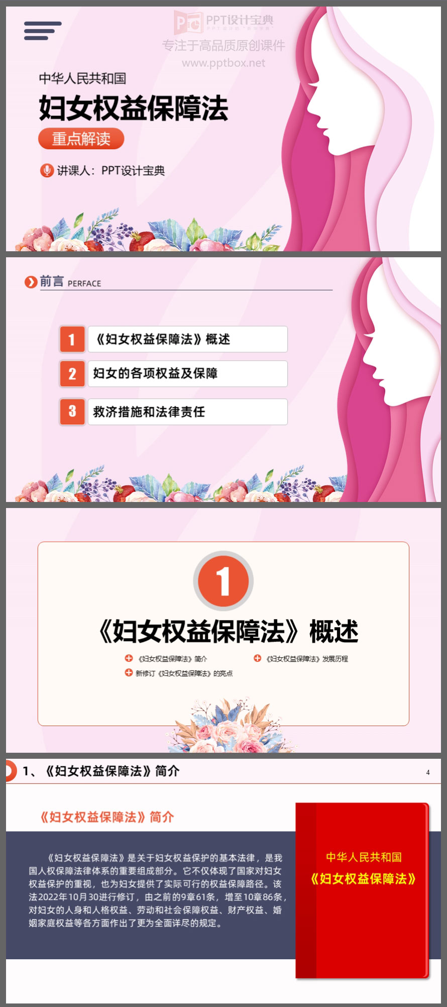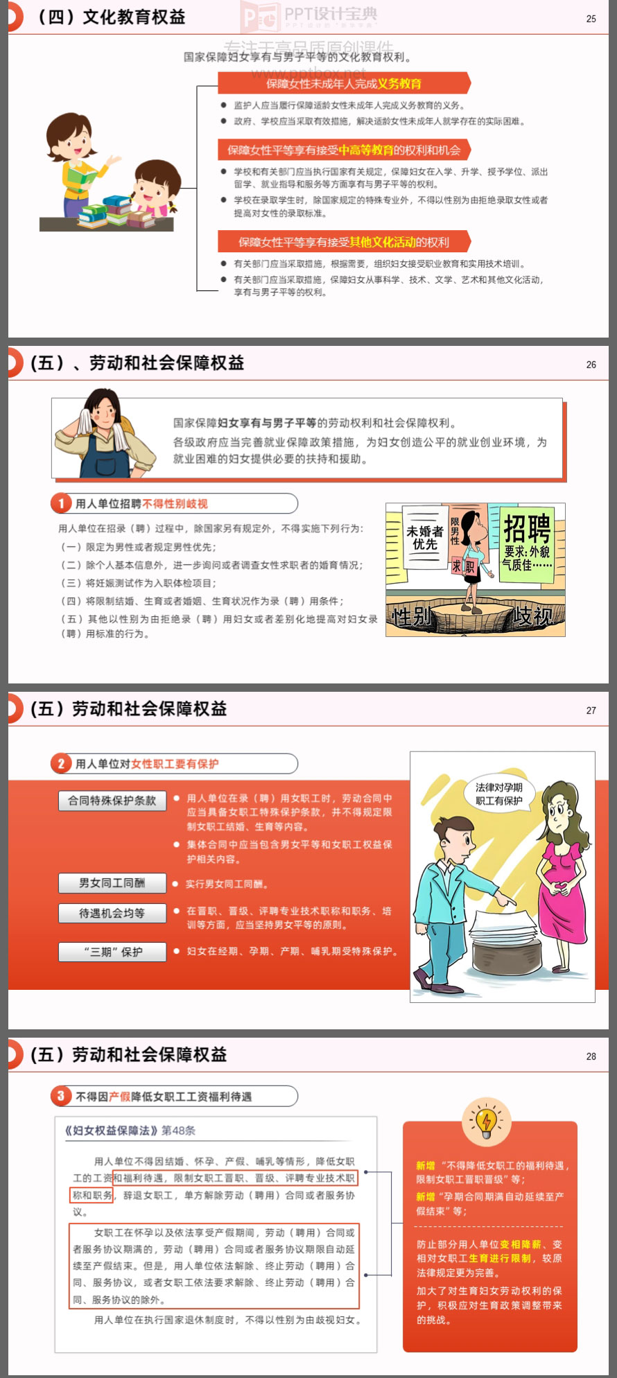本PPT就是以新修订的《妇女权益保障法》为蓝本制作。涉及的知识点包括:新修订《妇女权益保障法》的亮点、妇女的各项权益及保障、救济措施和法律责任……等内容。