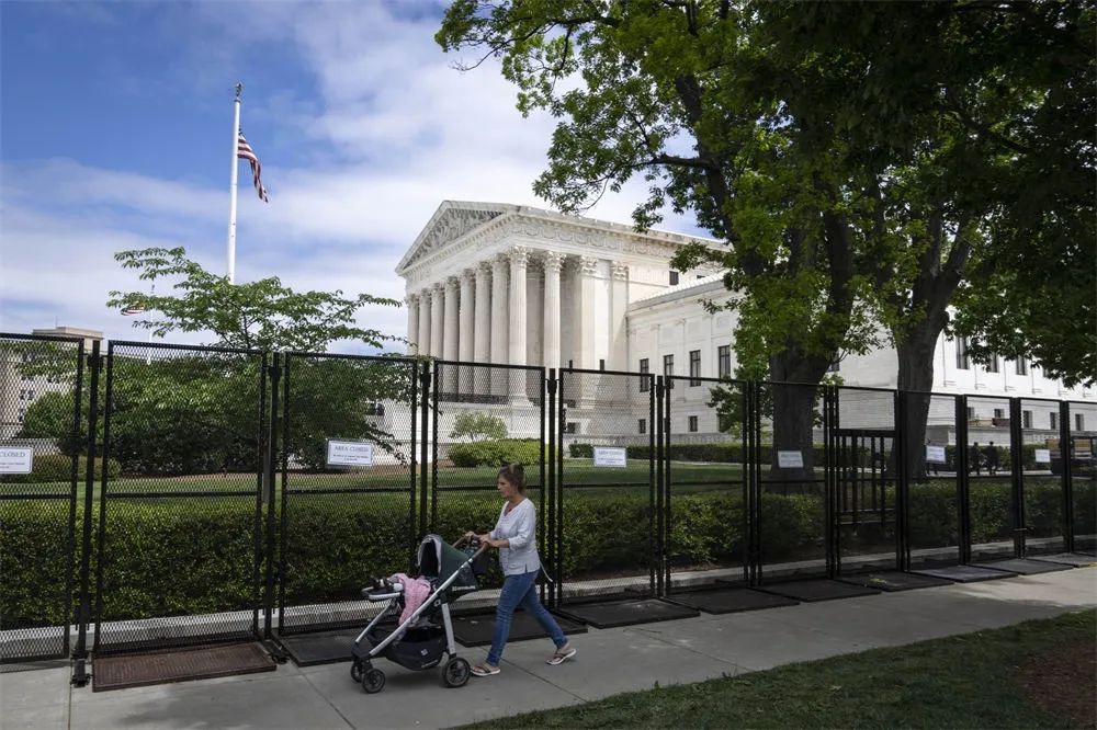 2022年5月11日,在美国首都华盛顿哥伦比亚特区,一名妇女推着婴儿车经过最高法院大楼。最高法院在罗伊判例风波中的表现,使得许多美国民众再度开始质疑这一制度的合理性