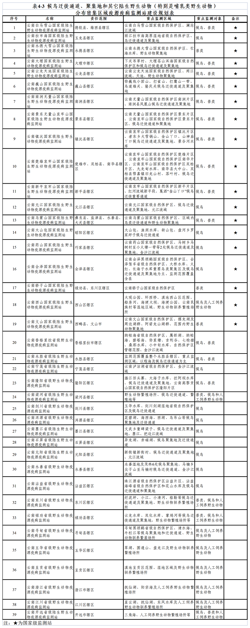 参照《云南省陆生野生动物疫源分布调查报告》(云南森林自然中心2016年10月),将可感染“重点监测疫病”(高致病性禽流感、新城疫、鼠疫、狂犬病、巴氏杆菌病、冠状病毒(SARS)感染、布鲁氏菌病、小反刍兽疫、炭疽、非洲猪瘟)的物种,作为优先监测物种。