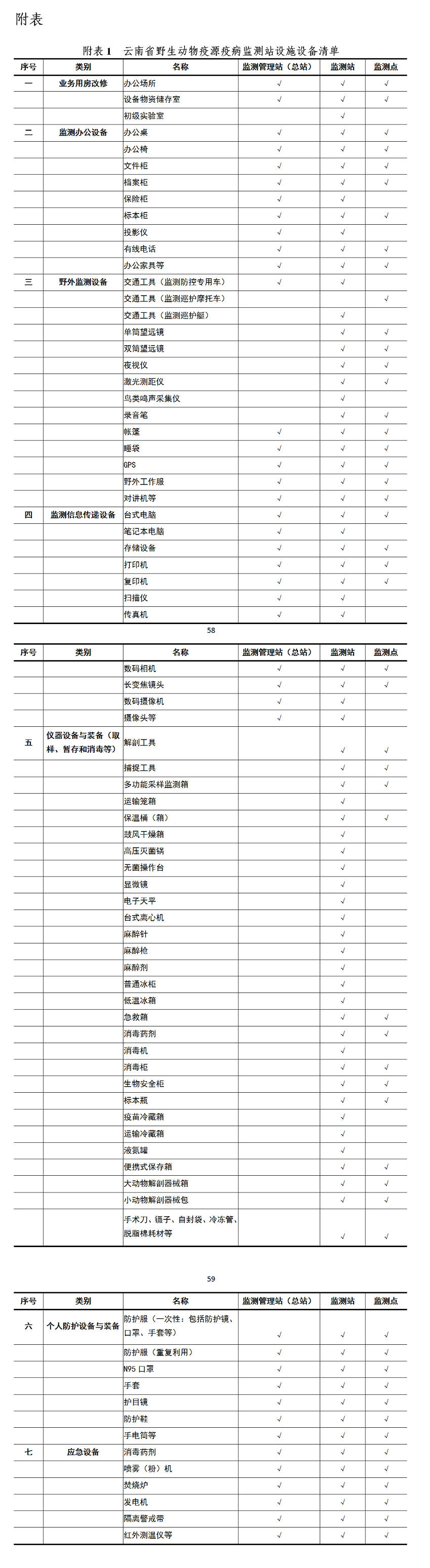 附表1 云南省野生动物疫源疫病监测站设施设备清单