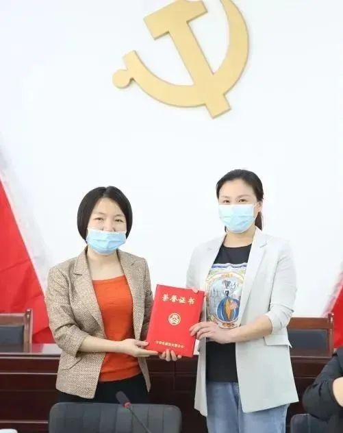 随州市妇联主席张春霞给牛雨同志颁发荣誉证书