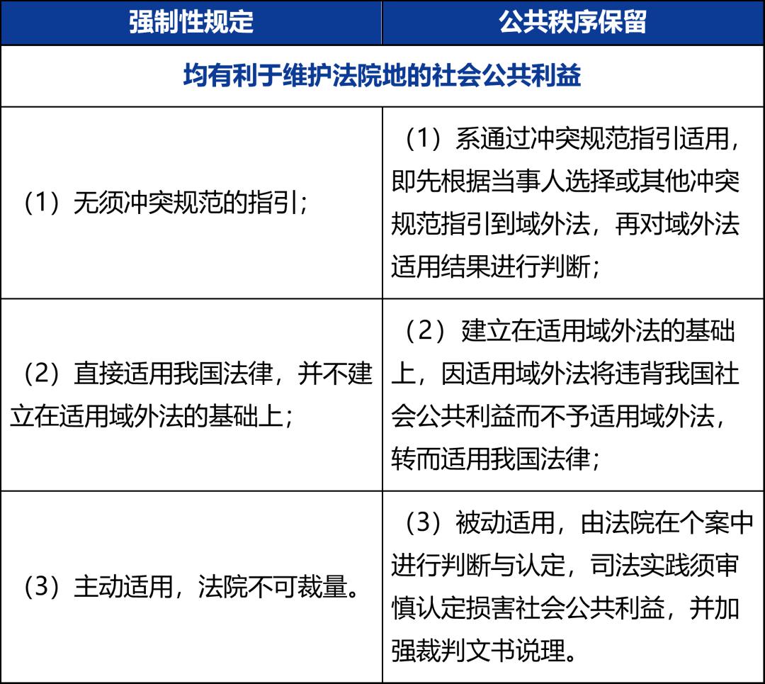 表2:强制性规定与公共秩序保留的区别