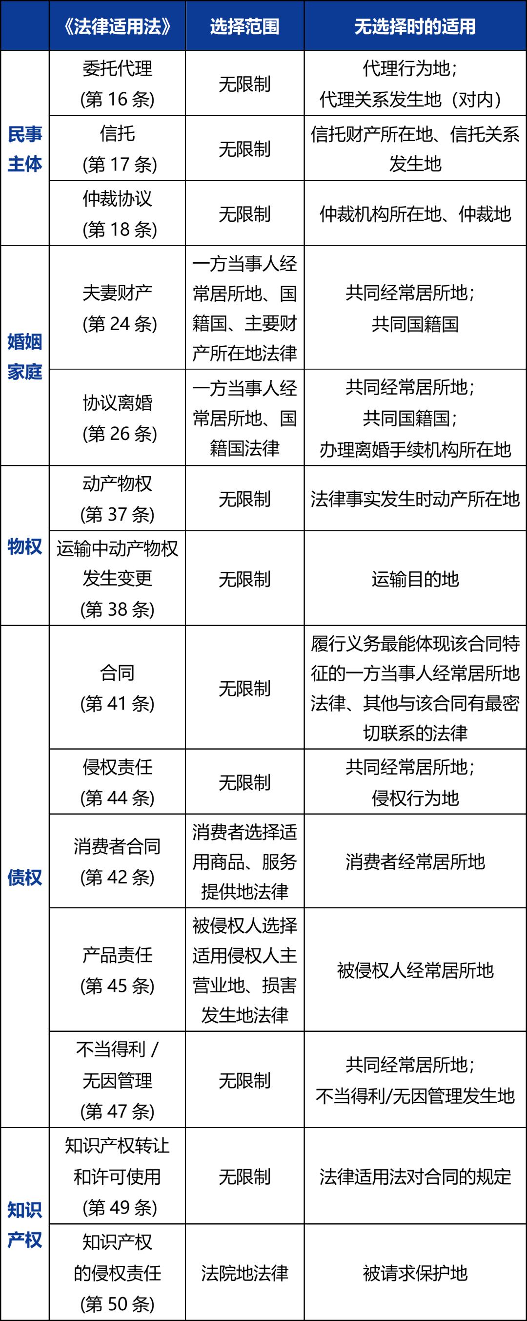《法律适用法》将当事人选法从涉外合同领域扩展至代理、信托、仲裁协议、夫妻财产关系、动产物权、侵权、不当得利与无因管理、知识产权等。