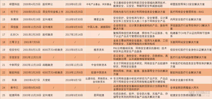 安芯网盾、梆梆安全、联创科技相继完成融资,迪普科技、安恒信息也分别在创业板、科创板上市。观安在第一季度完成超1亿元B+轮融资,为这一领域开了个好头,奇安信在9月完成了15亿元的Pre-IPO融资。