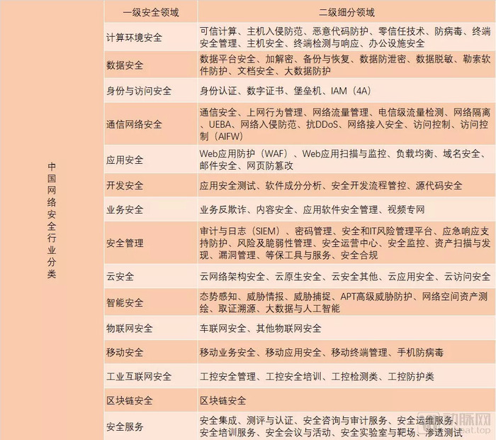 2020年3月,企业级信息安全市场专业咨询机构“安全牛”发布了“2020年中国网络安全行业全景图”。该全景图共分为16类一级安全领域(实际收录15类),100类二级细分领域(实际收录88类)。动脉网整理如下: