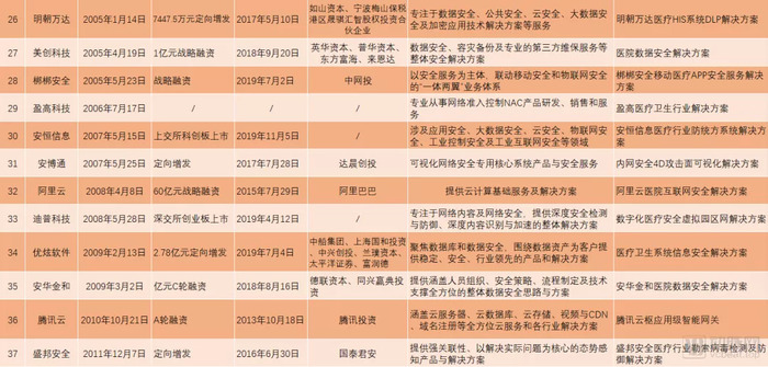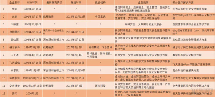 上述表格中的每个细分领域都不乏掘金者,技术从业者们从自身优势出发,与信息安全较劲,在数个甚至数十个安全细分领域中填补安全漏洞。基于此,动脉网整理了46家业务涉及到医疗行业网络安全解决方案的信息安全企业: