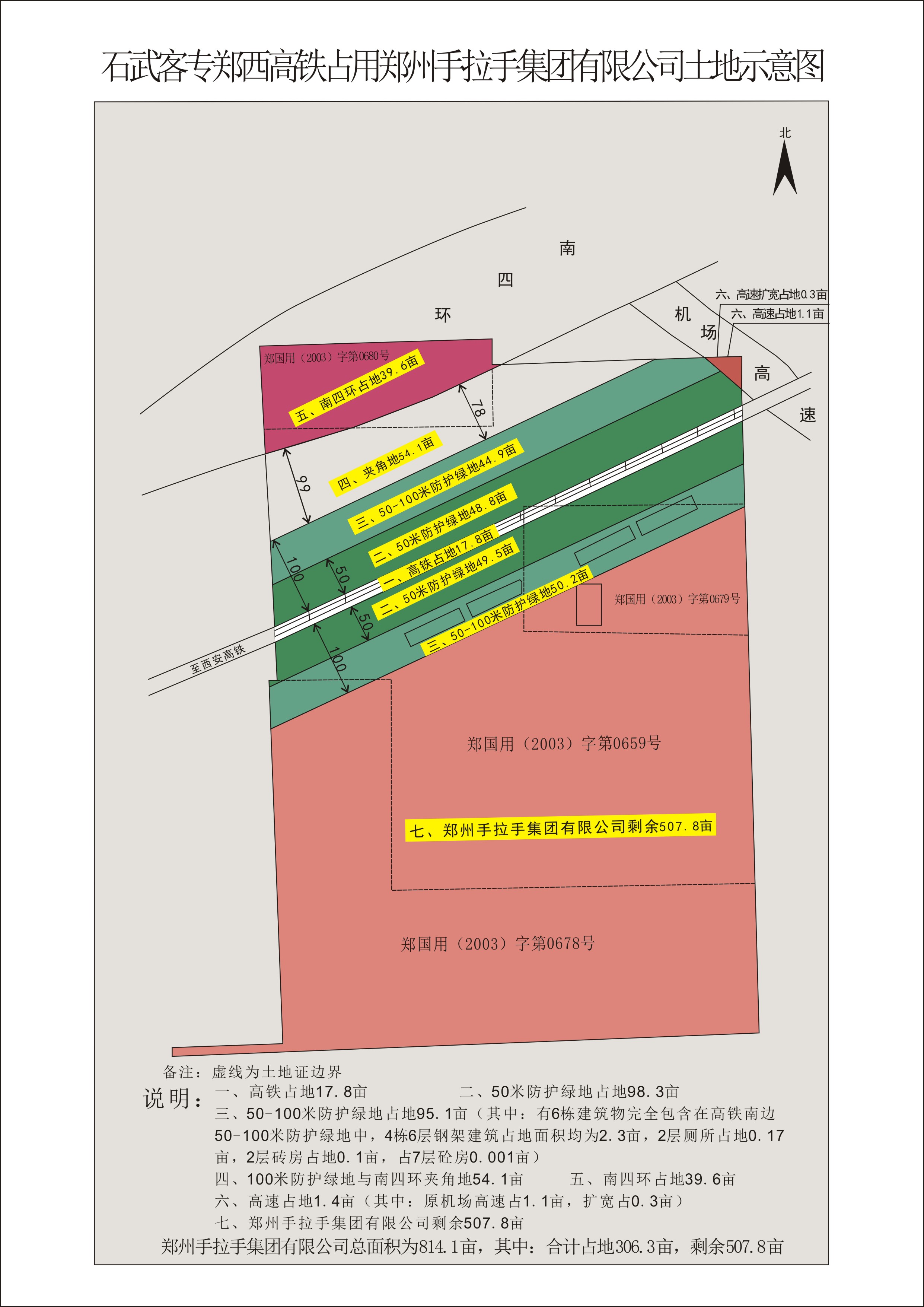 2009年6月,郑州市城市规划局在呈给郑州市政府的报告中称,石武客运专线是国家重点铁路项目,在客运专线穿越手拉手集团的铁路两侧各预留100米的防护绿地,在该区域内不得进行住宅建设。