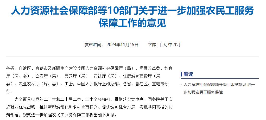 央视网消息:据人力资源社会保障部、国家发展改革委、教育部、公安部、民政部、司法部、住房城乡建设部、农业农村部、人民银行、全国总工会,为全面贯彻党的二十大和二十届二中、三中全会精神,贯彻落实党中央、国务院关于实施就业优先战略、推进新型城镇化和乡村全面振兴、促进城乡融合发展、实现共同富裕的决策部署,现就进一步加强农民工服务保障工作提出如下意见。