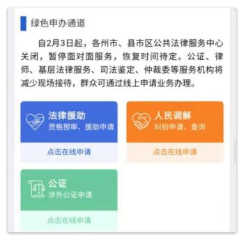开通法律援助、人民调解、公证(涉外公证)三项法律服务的绿色申办通道,一键申请、在线办理。