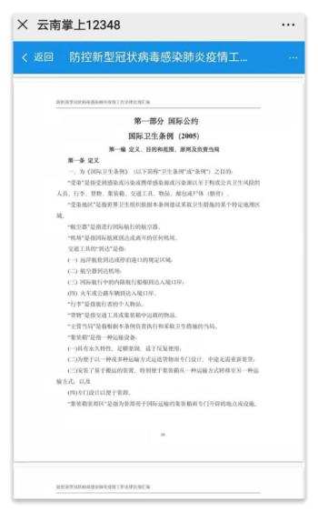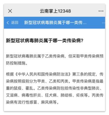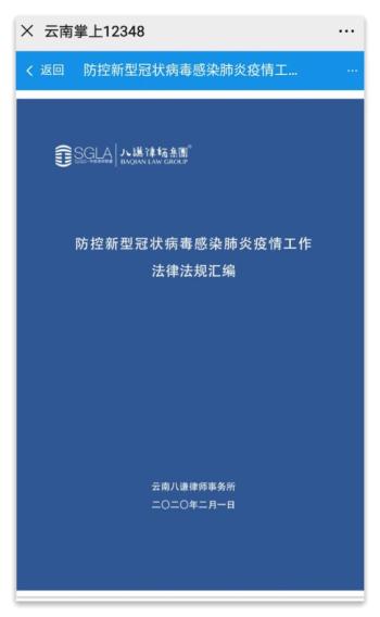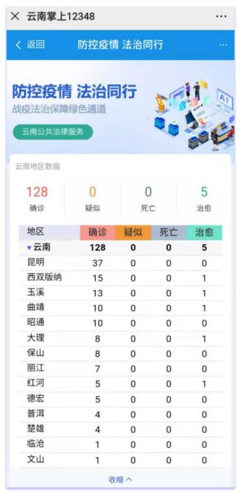 为贯彻落实习近平总书记相关指示要求,配合做好云南省重大突发公共卫生事件一级响应的有关事宜,根据《云南省人民政府办公厅关于疫情防控期间加强政务服务网上办理工作的通知》要求,我省进一步做好防范疫情法治保障和法律服务工作,充分利用12348云南法网和云南掌上12348微信公众号两个网络平台引导群众网上自助办理各类公共法律服务事项,确保企业和群众“办事不出门,事项网上办”。还特别针对本次疫情的特殊情况,开通了“战疫法治保障绿色通道”,人民群众可以通过该网上通道查询云南地区疫情状况,查询疫情相关的法律问题,一键拨打疫情信息反映、投诉举报、工作建议及咨询电话,还可以直接线上申请办理法律援助、人民调解、公证等公共法律服务事项。