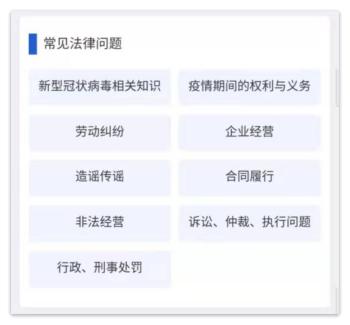 提供疫情期间的权利与义务、劳动纠纷、企业经营、造谣传谣、合同履行、非法经营、诉讼/仲裁/执行问题、行政/刑事处罚等法律问题的咨询服务,选择问题类别,查看问题清单,点击想要咨询的问题,立即获得详细的解答。
