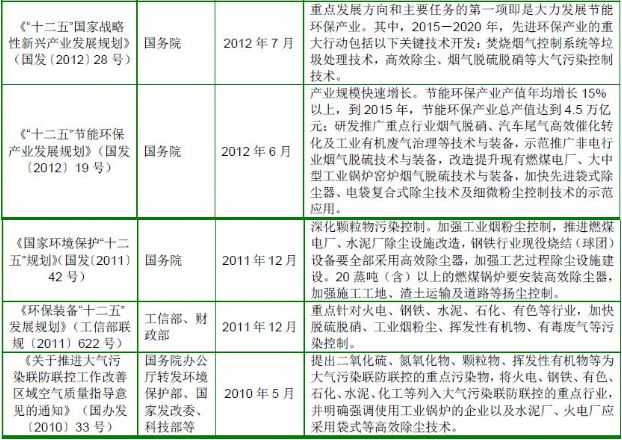 根据《国务院关于印发大气污染防治行动计划的通知》(国发〔2013〕37号)的要求,到2017 年,全国地级及以上城市可吸入颗粒物浓度比2012 年下降10%以上;京津冀、长三角、珠三角等区域细颗粒物浓度分别下降25%、20%、15%左右;加快重点行业脱硫、脱硝、除尘改造工程建设。所有燃煤电厂、钢铁企业的烧结机和球团生产设备、石油炼制企业的催化裂化装置、有色金属冶炼企业都要安装脱硫设施,每小时20 蒸吨及以上的燃煤锅炉要实施脱硫。除循环流化床锅炉以外的燃煤机组均应安装脱硝设施,新型干法水泥窑要实施低氮燃烧技术改造并安装脱硝设施。燃煤锅炉和工业窑炉现有除尘设施要实施升级改造;京津冀、长三角、珠三角等区域要于2015 年底前基本完成燃煤电厂、燃煤锅炉和工业窑炉的污染治理设施建设与改造,完成石化企业有机废气综合治理。