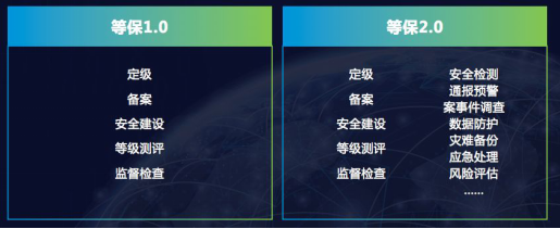 等级保护内容大不同除了满足等保1.0时代定级、备案、安全建设、等级测评和监督检查五个规定动作以外,等保2.0把安全检测、通报预警、案事件调查等措施都将全部纳入等级保护制度并加以实施。