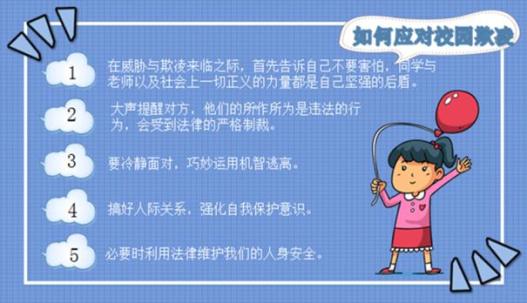 通过讲述两个曾经办理过的案件讲起,让大家对校园欺凌类型及概念有更加直观的认识。校园欺凌不仅仅给受害者造成了身体、心理、心灵的伤害,也使欺凌者误入歧途,受到学校家长的惩罚,甚至是法律的制裁,使这些孩子在本该最美好的少年时代亲手酿造了一个又一个令人心痛的悲剧。学生既是校园欺凌的受害者,同时又是防治校园欺凌的主要力量。法官助理姐姐告诉同学们在遭受校园欺凌到底应该怎们办?