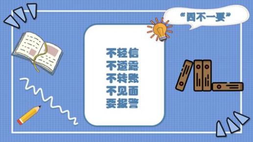 疫情发生以来,根据教育部“停课不停学”的要求,各学校纷纷开启线上教学的工作,网络的确给青少年学生们提供了便捷的学习机会,但很多学生尚未成年,社会阅历浅、好奇心强、自制力弱,容易被不良信息影响,另外新型诈骗也在网络负面信息的土壤下滋生,给网络环境带来了严重的“安全隐患”。青少年学生们在发现自己遭遇诈骗时要第一时间与家长沟通,及时报警。做到“四不一要”:不轻信、不透露、不转账、不见面、要报警。