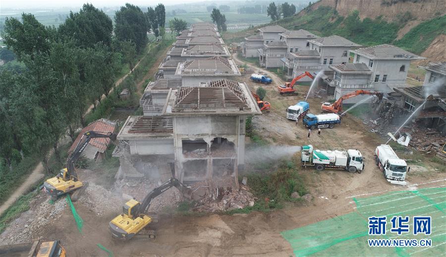大型机械对西安市?邑区蒋村镇的违建别墅进行拆除(2018年8月14日无人机拍摄)。 新华社记者 邵瑞 摄