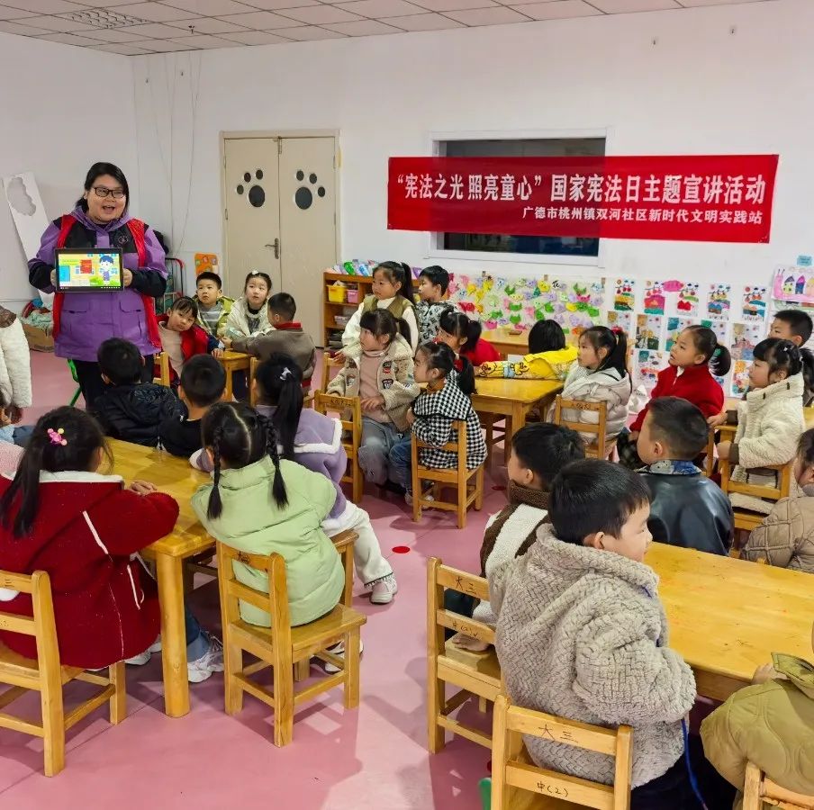 桃州镇双河社区妇联邀请安徽渊源律师事务所律师到海亮幼儿园开展“宪法之光照亮童心”普法宣传活动。