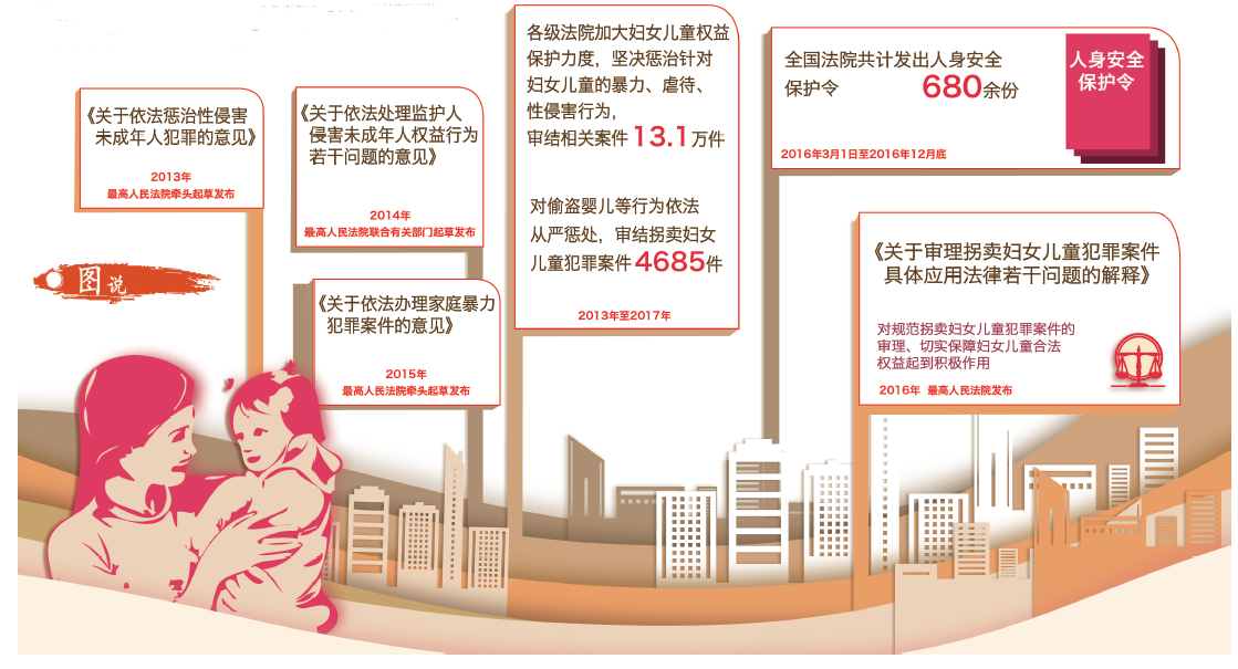 2013年,最高人民法院牵头起草发布了《关于依法惩治性侵害未成年人犯罪的意见》;2014年,最高人民法院联合有关部门起草发布《关于依法处理监护人侵害未成年人权益行为若干问题的意见》;2016年,最高人民法院发布了《关于审理拐卖妇女儿童犯罪案件具体应用法律若干问题的解释》,妇女儿童权益司法保护网进一步织密,对规范拐卖妇女儿童犯罪案件的审理、切实保障妇女儿童合法权益起到积极作用。