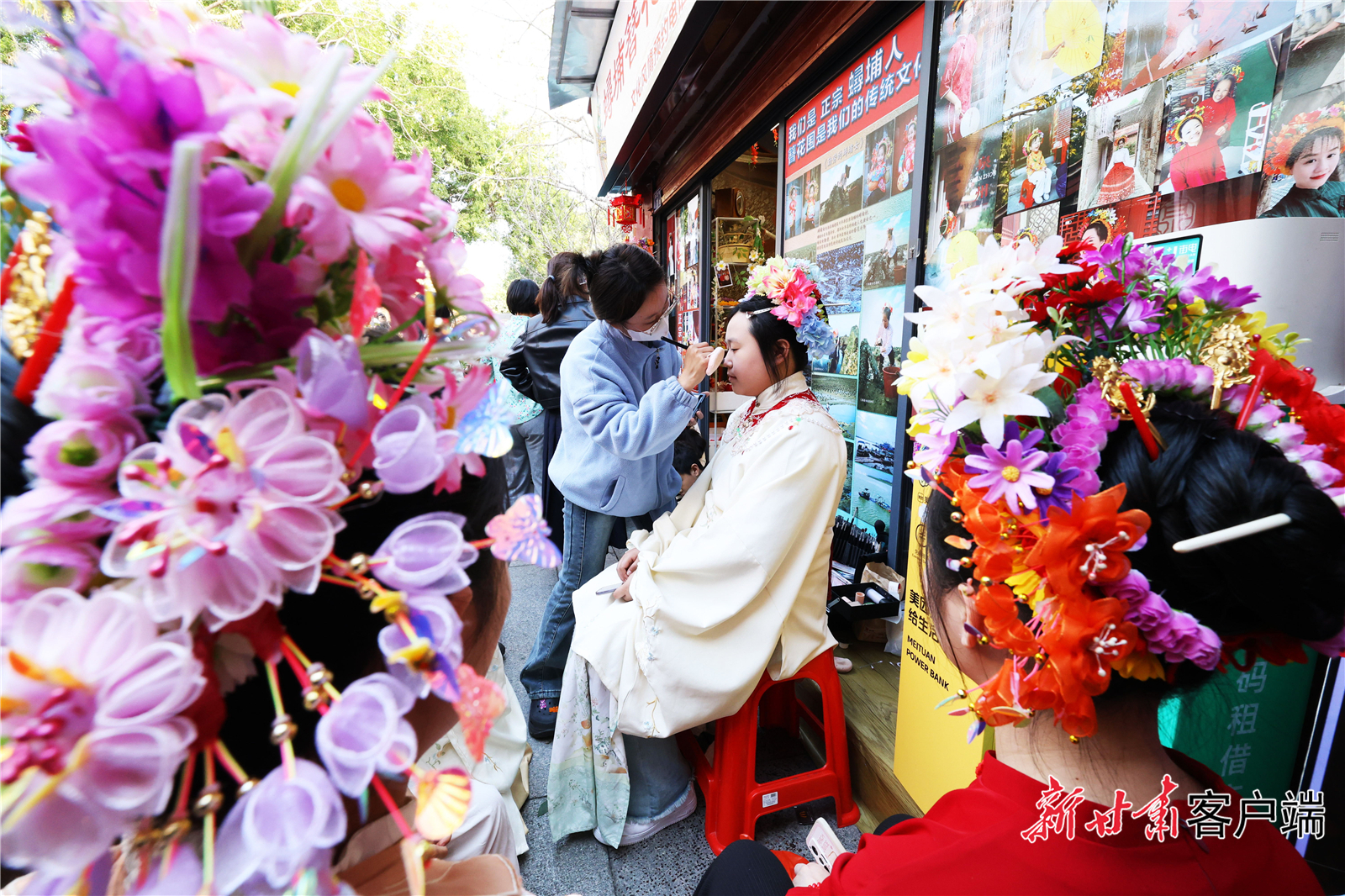 春节期间,游客体验戴簪花习俗。福建日报社通讯员林升摄