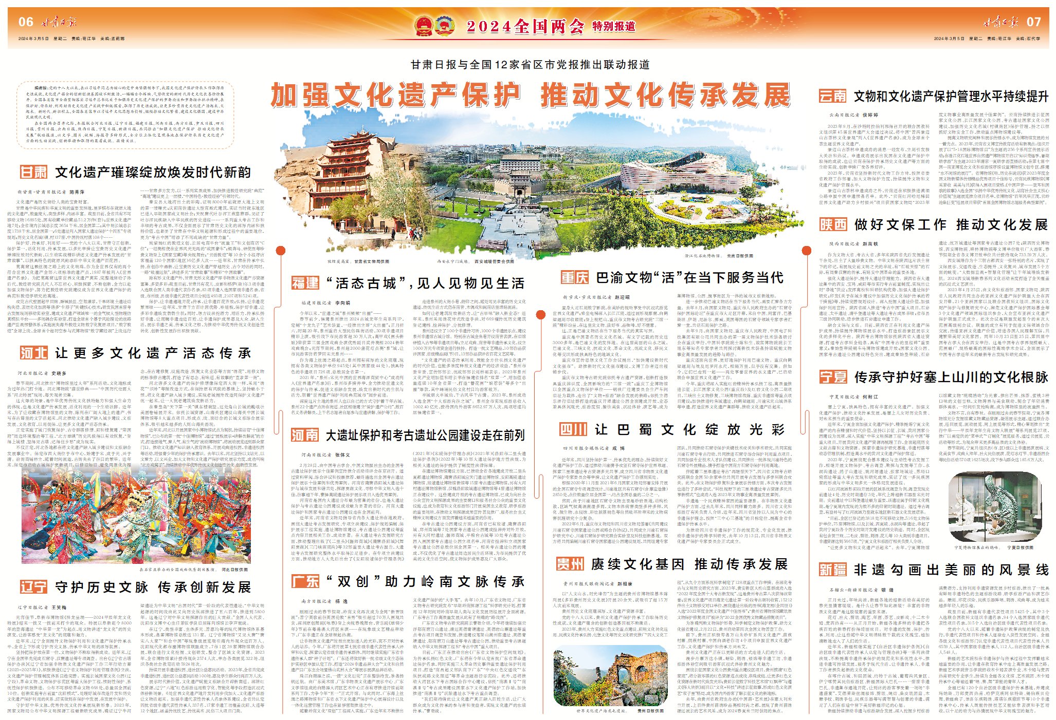 在全国两会召开之际,甘肃日报联合河北日报、辽宁日报、福建日报、河南日报、南方日报、重庆日报、四川日报、贵州日报、云南日报、陕西日报、宁夏日报、新疆日报,共同推出“加强文化遗产保护 推动文化传承发展”联动报道,以文字、图片、视频、海报等多种形式,全方位立体化呈现各地在保护传承历史文化遗产方面的生动实践、创新举措和取得的显著成就。敬请关注。