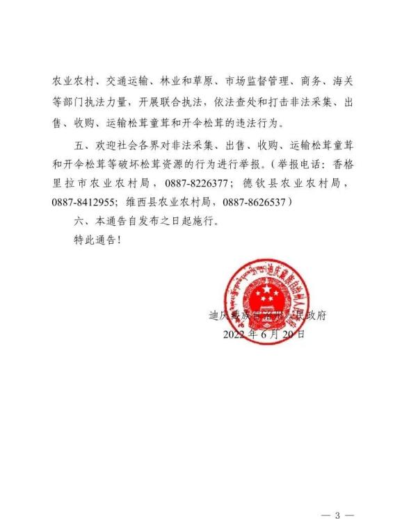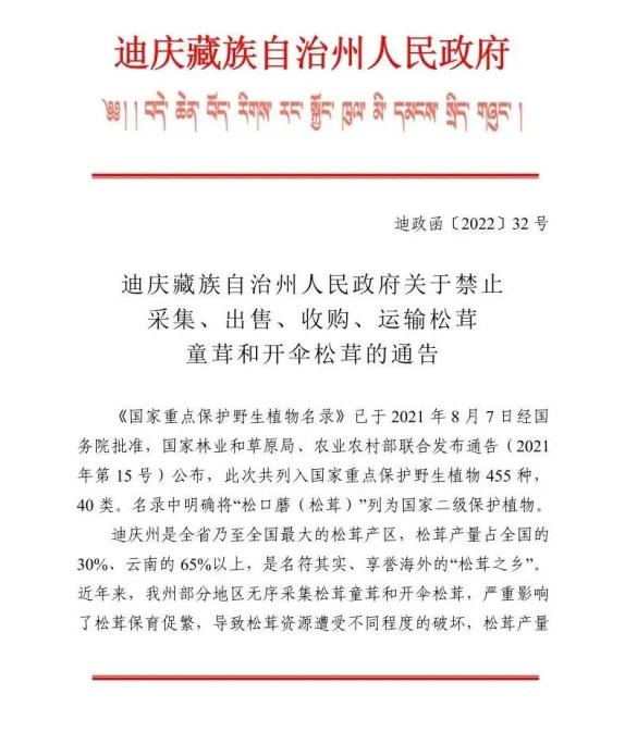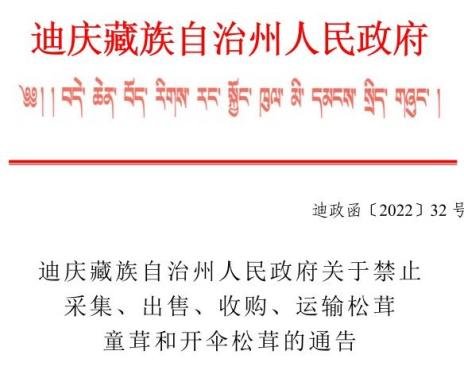 近日,迪庆州人民政府发布《关于禁止采集、出售、收购、运输松茸童茸和开伞松茸的通告》,公告显示:决定迪庆全州范围内禁止采集、出售、收购、运输松茸童茸和开伞松茸。