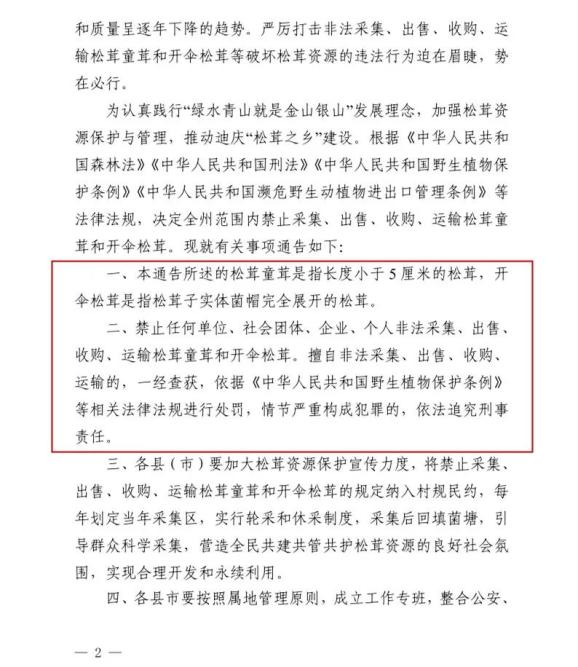 云南和与合律师事务所律师郑虹余介绍,迪庆州发布的“禁菌”通告,其实是当地政府依据我国《野生植物保护条例》《国家重点保护野生植物名录》等作出的进一步规定。2021年新修订的《国家重点保护野生植物名录》,共列入国家重点保护野生植物455种和40类(其中一级保护野生植物54种和4类,二级保护野生植物401种和36类)。《野生植物保护条例》明确规定,禁止采集、出售、收购国家一级保护野生植物;采集、出售、收购国家二级保护野生植物应按法律规定办理审批手续。违反条例非法采集、出售、收购的,将面临相应的行政处罚,甚至刑事责任。