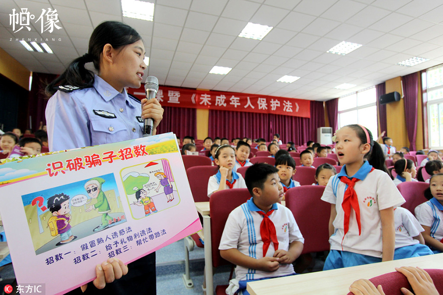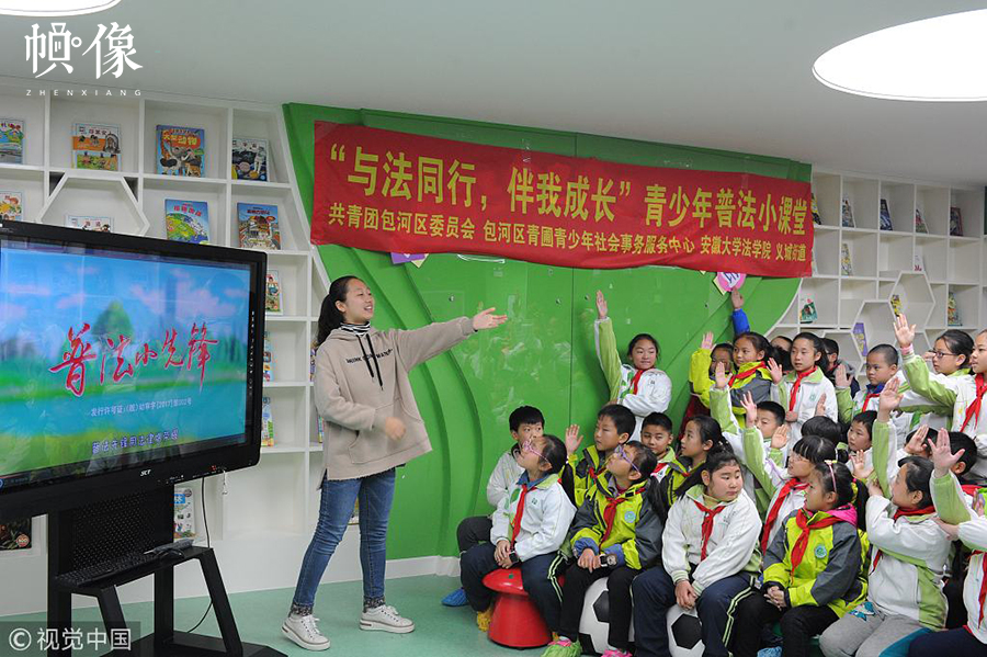 2017年11月30日,合肥,法学院志愿者在普法小课堂与学生互动。当日,中国法制宣传日即将来临之际,在安徽合肥义城街道华山路小学,开展“与法同行,伴我成长”青少年普法小课堂活动。通过现场教学,互动交流,观看视频的方式,将未成年人保护法、交通法带入学校,普及给同学们,营造良好的知法懂法守法的氛围。视觉中国