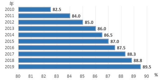 3.高中阶段教育规模持续扩大。近年来,随着《高中阶段教育普及攻坚计划(2017-2020年)》的深入实施,义务教育普及成果不断得到巩固,高中阶段毛入学率不断提升。2019年,全国高中阶段教育共有学校24375所,比上年增加55所,增长0.2%。全国招生1439.9万人,在校学生3994.9万人,分别比上年增长6.7%和1.5%。全国高中阶段毛入学率达89.5%,比上年提高0.7个百分点,进一步接近“达到90%”的《纲要》目标(见图4)。