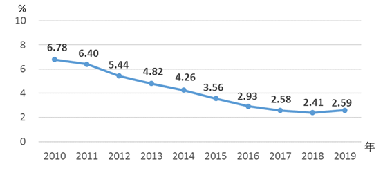 1.儿童健康水平显著提升。2010年以来,我国覆盖城乡的儿童健康服务体系进一步完善,儿童医疗保健服务能力不断加强,儿童健康水平显著提升,儿童死亡率持续下降(见图1)。2019年,婴儿死亡率和5岁以下儿童死亡率分别为5.6‰、7.8‰,分别比上年下降0.5和0.6个千分点,明显低于10‰和13‰的《纲要》目标。18岁以下儿童伤害死亡率为11.42/10万,比上年下降2.7%,比2010年下降49%,下降幅度明显高于“以2010年为基数下降1/6”的《纲要》目标。