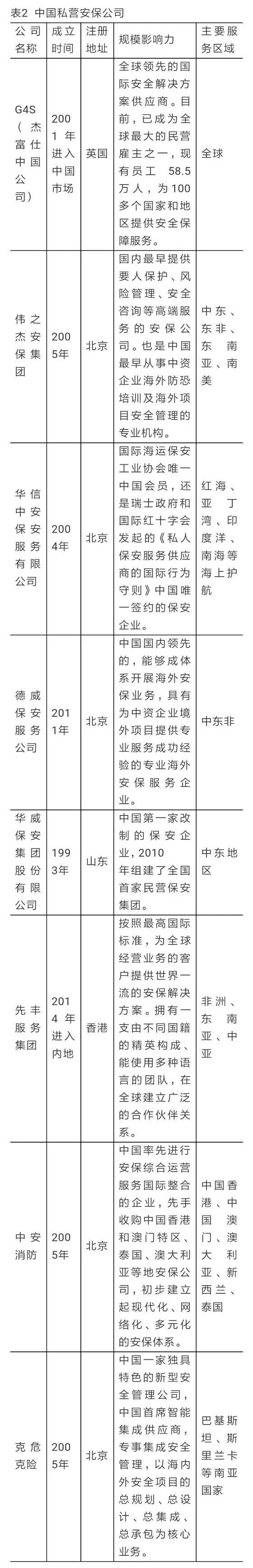 随着中国海外投资增加,遍布世界的中国企业可能成为全球私营安保公司的重要客户。在2012年联合国大会上,中国政府赞成就制定一个私营安保公司的国际规章框架问题展开深入讨论。可见,中国政府并不排斥私营安保公司的发展,主张加强国际磋商,寻求合理规制,发挥其正面作用,抑制其不良影响。目前,中国并不存在类似于国外的私营安保公司,但中国有大量的提供安全保障服务的安保服务公司。虽然中国安保服务公司与国外私营军事公司有极大的区别,但在安全培训、情报提供、风险评估、后勤服务保障等安全保护方面,有着共同一致性。截至2017年,中国大约有4 000余家安保公司,但开展海外业务的寥寥无几。目前中国开展海外业务的安保公司不超过40家,真正能够拿到业务订单的仅有几家,如伟之杰安保集团、华信中安集团、德威、克危克险等公司(见表2)。