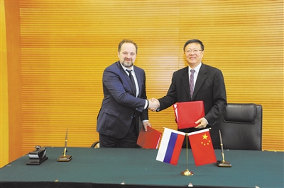 会后,环境保护部部长陈吉宁与俄罗斯自然资源与生态部部长东斯科伊签署会议纪要。记者 贾继恒 摄