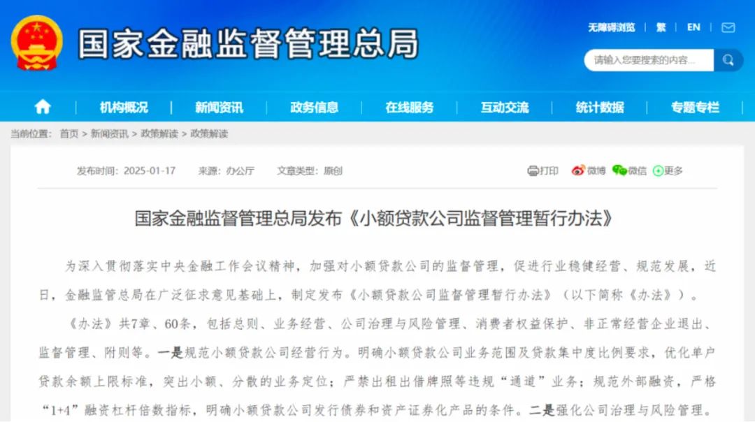 1月17日,国家金融监督管理总局(以下简称金融监管总局)正式发布《小额贷款公司监督管理暂行办法》(以下简称《办法》),《办法》自印发之日起施行。