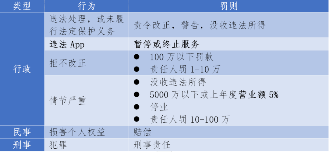 接下来看一下《个人信息保护法》的罚则,简要的梳理见下表。