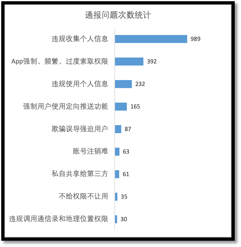 通过对工信部的通报情况进行分析,可以明显的看出,问题最多的是“违规收集个人信息”,占比达到70.4%。其次是过度索取权限、强制推送、欺骗误导、账号难注销、私自共享、不给权限不让用,以及最新一次通报的违规调用通讯录和地理位置。