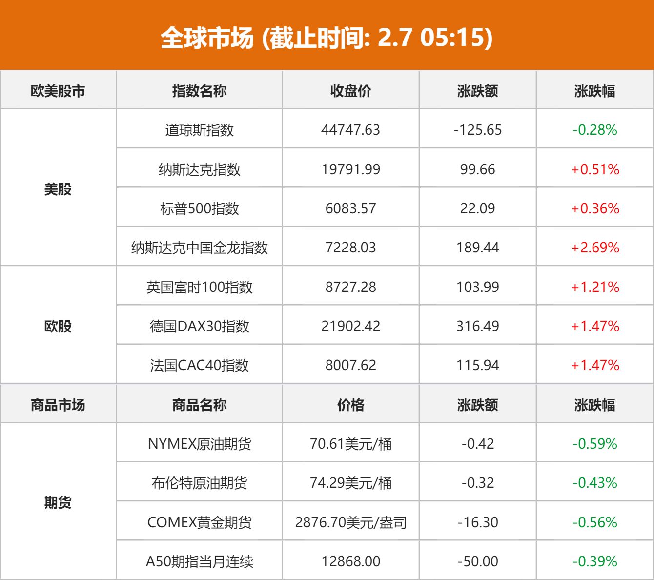 美股:道琼斯工业平均指数比前一交易日下跌125.65点,收于44747.63点,跌幅为0.28%;标准普尔500种股票指数上涨22.09点,收于6083.57点,涨幅为0.36%;纳斯达克综合指数上涨99.66点,收于19791.99点,涨幅为0.51%。