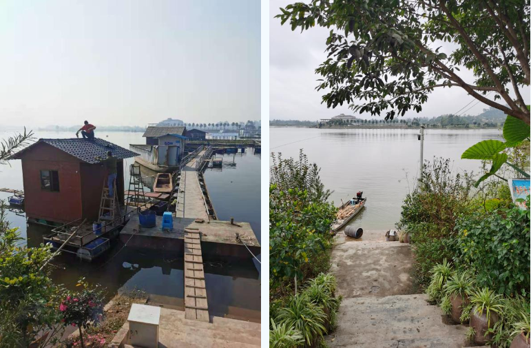 左图:黎家湖度假村渔排拆除前 右图:黎家湖度假村渔排拆除后