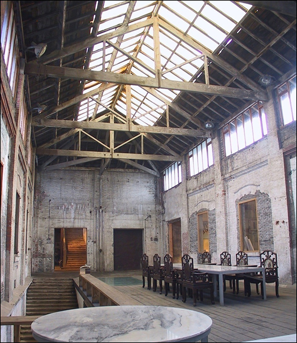 王林:1999年,在乌镇路桥附近有一个仓库,当时它的周边区域被规划成滨河绿地,也就是后来的九子公园,仓库因而面临拆除。我负责审批这个项目,到了现场,我发现了这座仓库,外墙上写着“1931”的字样,当时仓库的底层有一扇高而精致的铝合金大门,在破败的仓库里显得很突出,我推门进去,沿着仓库平缓的楼梯拾级而上,里面的景象让我感到震惊:仓库清理得很干净,抵达的二层大厅放着大理石的长条桌,两边是中式的椅子。仓库的层高很高、加上的大厅空高是两层的挑空,坡屋顶的局部被改造装上了玻璃窗,空间里充满柔和的光线。自然斑驳的砖墙和本色的木构架,内墙很干净,但没有涂刷一新,而是保留了仓库的砖石和木结构的状态。