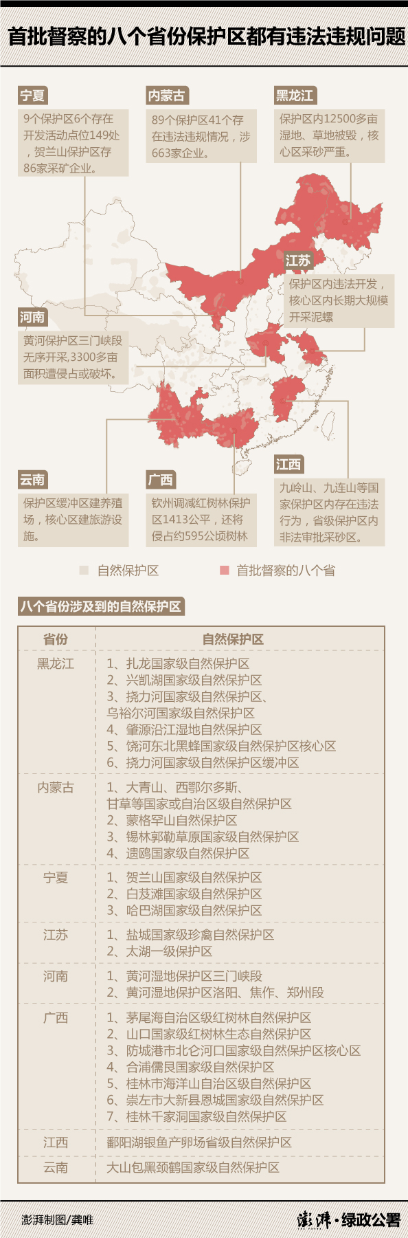 11月23日,首批中央环保督察组反馈督察意见工作结束,第一批8个省份无一例外皆存在自然保护区内违法违规问题,数量之多,问题之普遍,发人警醒。