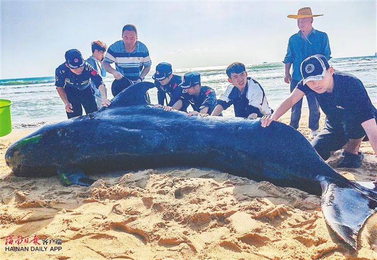 一头受伤的鲸鱼在文昌市龙楼镇铜鼓岭海边的沙滩上搁浅。救援人员一边用湿布盖住鲸鱼身体,持续给鲸鱼身上泼水,保持鲸鱼体表湿润。因鲸鱼太重,工地的施工队开来一台铲车,小心翼翼地将鲸鱼搬到救援车上,送到蓝海保育救护中心做进一步救治。