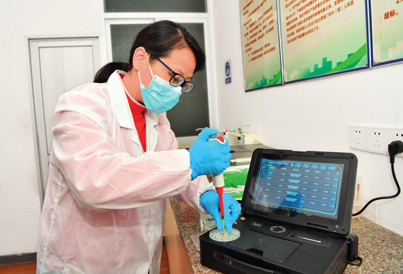 福建省福州市永泰县农业农村局检测员对送检的蔬菜进行农残快检(2023年2月10日摄)姜克红摄/本刊