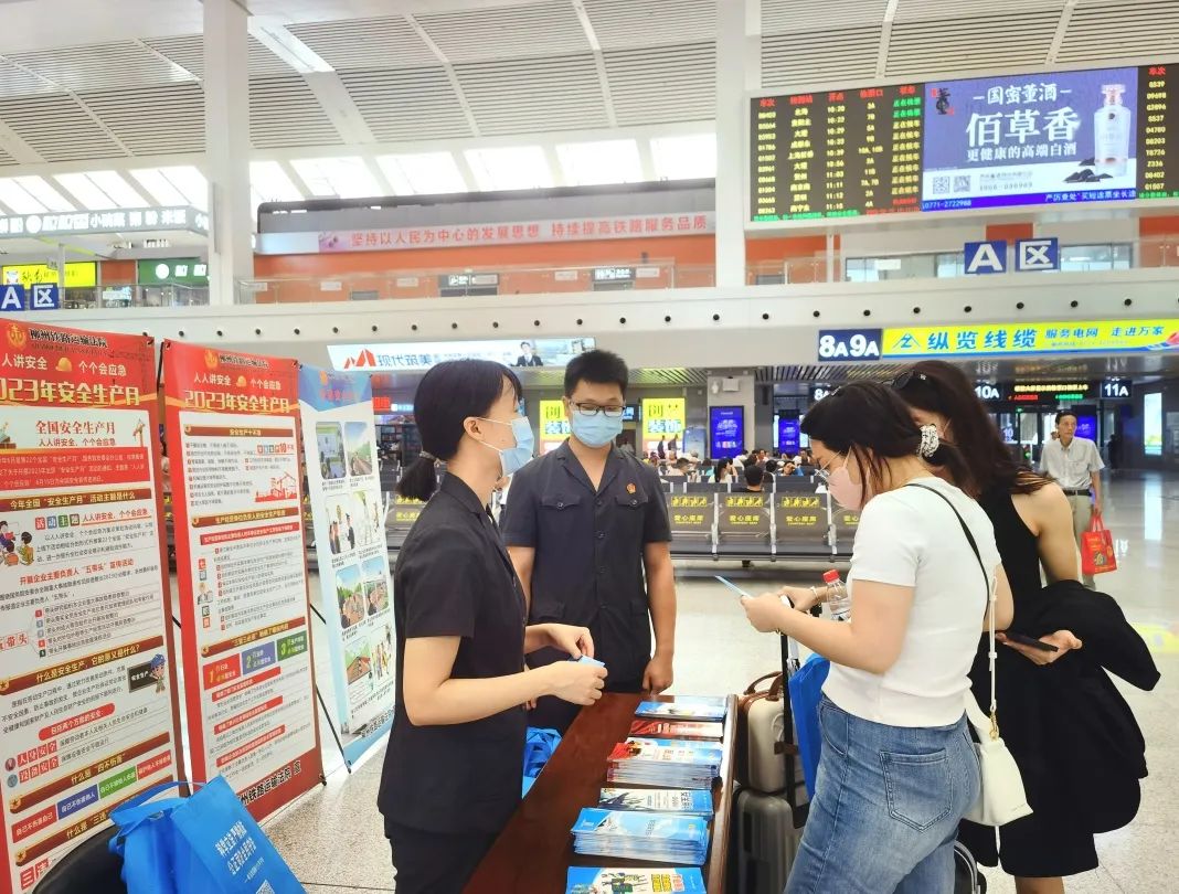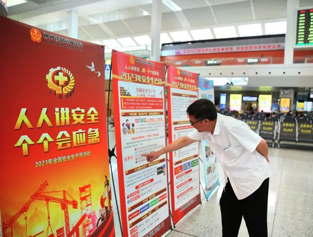 柳铁法院还组织干警在柳州站候车大厅开展“人人讲安全,个个会应急”主题普法宣传活动。活动现场,干警们通过摆放展板、发放宣传手册等方式,紧紧围绕活动主题,结合与群众密切相关生活的常见事故急救自救互救、安全用电、工伤预防、铁路安全等知识和《安全生产法》、《民法典》等法律法规开展专项宣传,向往来旅客发放宣传手册,普及相关法律法规知识,为群众答疑解惑,引导群众增强安全防范意识,积极做安全生产的参与者、传播者、监督者。