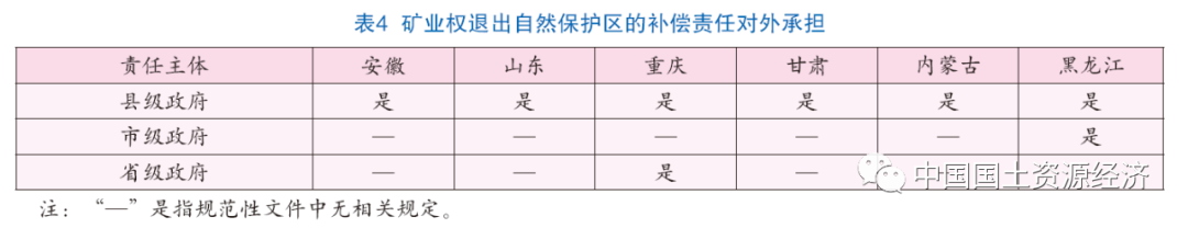 在补偿责任的对外承担上(表4),除黑龙江省、重庆市分别将市级政府、省级政府添加为责任主体外,各地普遍由县级政府向矿业权人支付补偿。在补偿责任的内部划分上(表5),安徽省和甘肃省规定由市县承担筹措补偿资金的主要责任,内蒙古自治区规定自治区、市、县依据分成比例分担补偿责任,山东省和黑龙江省并无明确规定。重庆市则按照审批发证权限和矿业权类型予以区分,县级审批发证的采矿权由市县补偿,省级审批发证的采矿权由省市县分担补偿,探矿权由省级补偿。